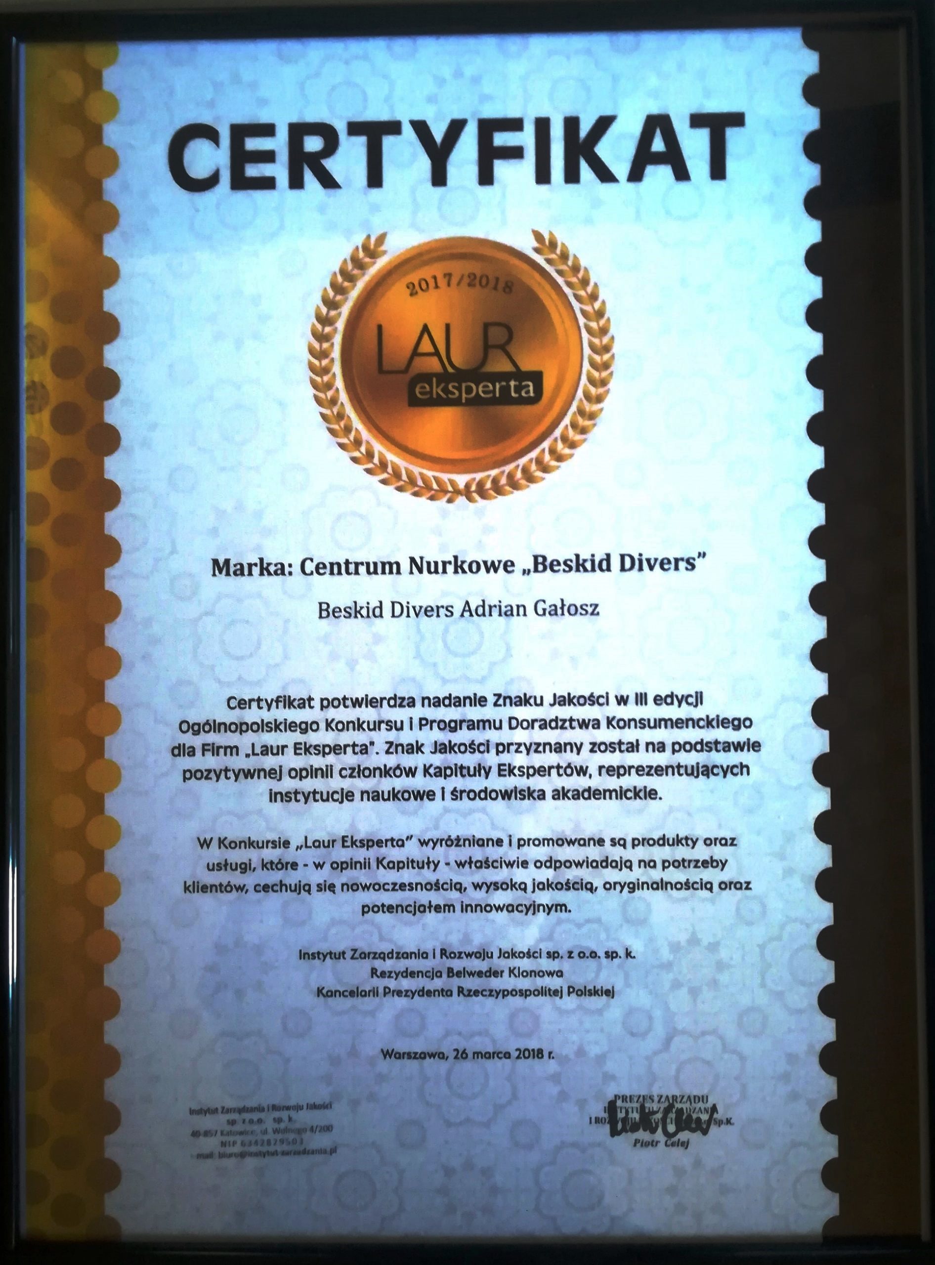 Centrum Nurkowe BeskidDivers Adrian Gałosz przeprowadziło Kursy Instruktorskie, Kursy Nurkowania Rekeracyjnego które doprowadziły do uzyskania certyfikatu ISO dla IANTD International Association of Nitrox & Technical Divers United States of Amercica dla całego Świata !